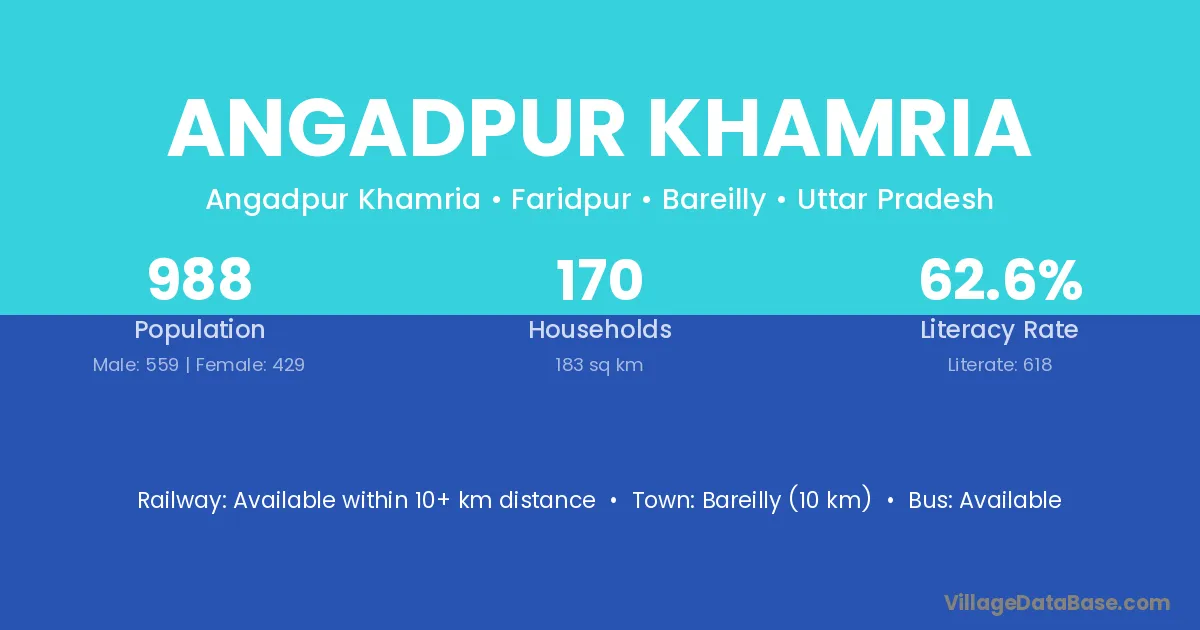 Bareilly (10 km) is the nearest town to Angadpur Khamria village for major economic activities and is located approximately 10 km away.