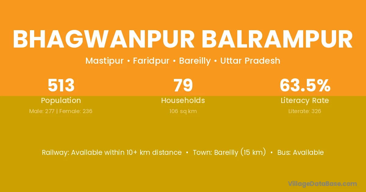 Bareilly (15 km) is the nearest town to Bhagwanpur Balrampur village for major economic activities and is located approximately 15 km away.