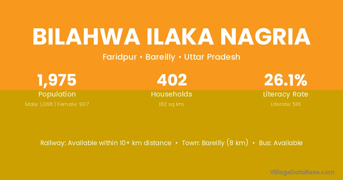 Bareilly (8 km) is the nearest town to Bilahwa Ilaka Nagria village for major economic activities and is located approximately 8 km away.