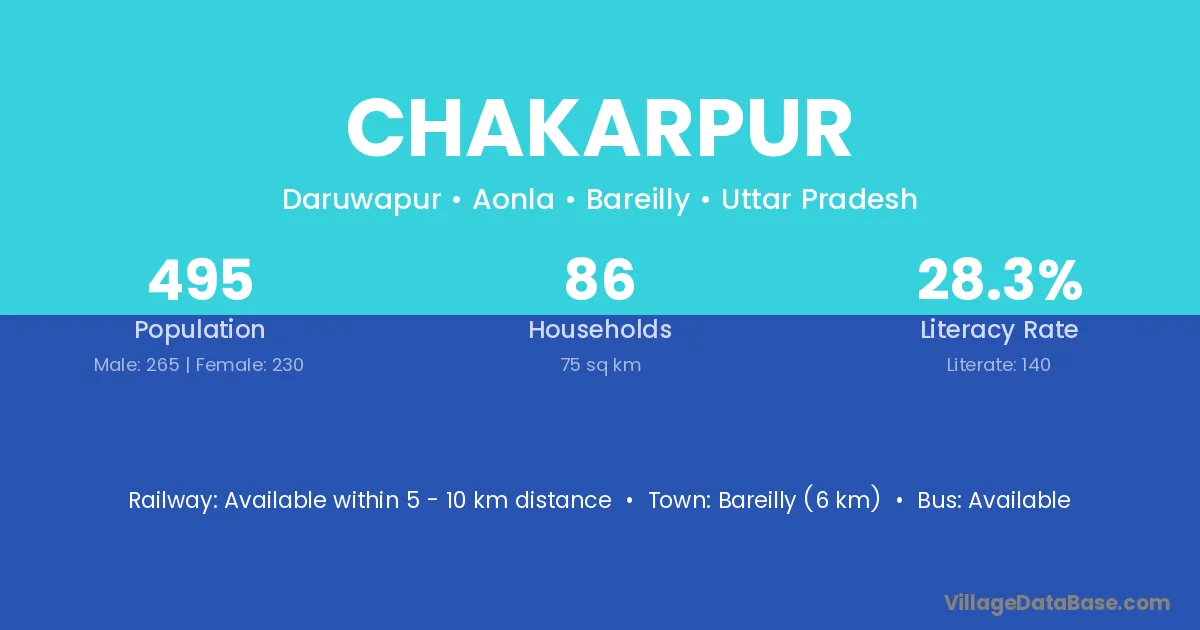 Chakarpur village has a total population of 483 people, of which 272 are males and 211 are females.