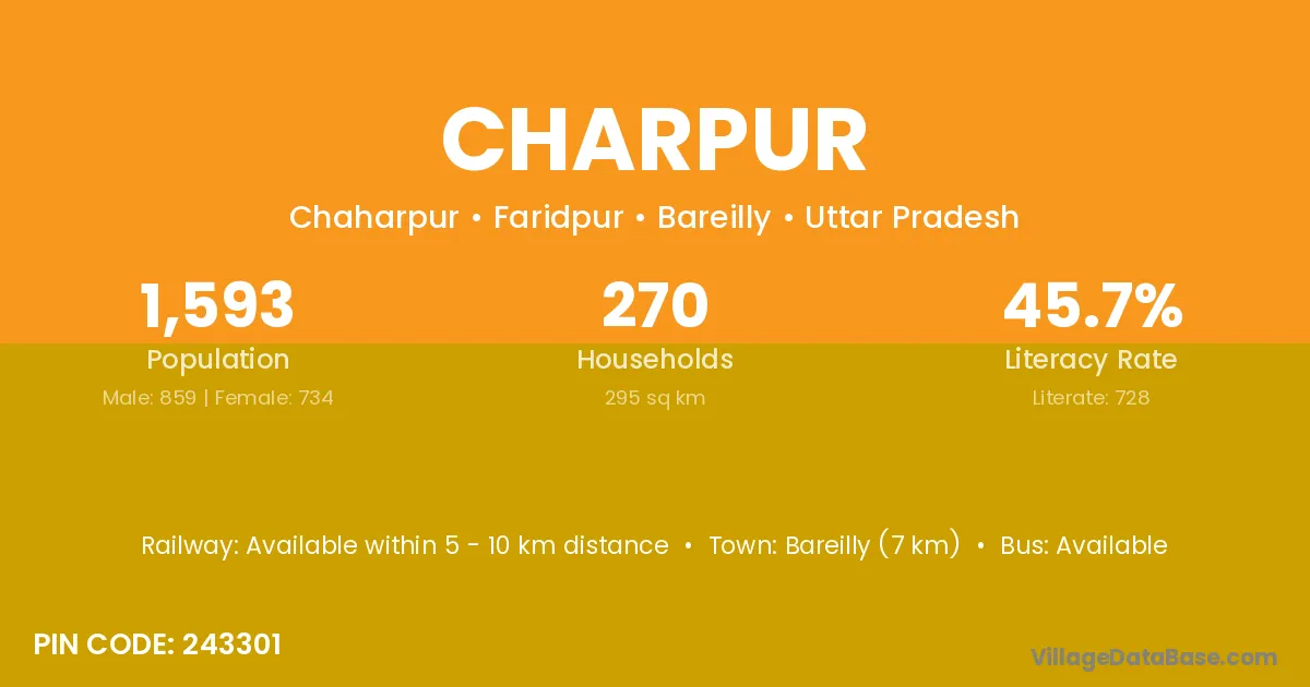 Bareilly (7 km) is the nearest town to Charpur village for major economic activities and is located approximately 7 km away.