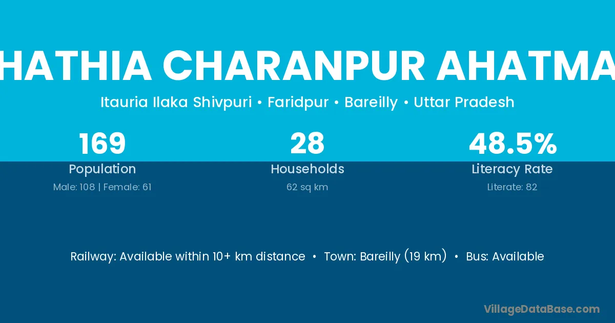 Bareilly (19 km) is the nearest town to Chathia Charanpur Ahatmali village for major economic activities and is located approximately 19 km away.