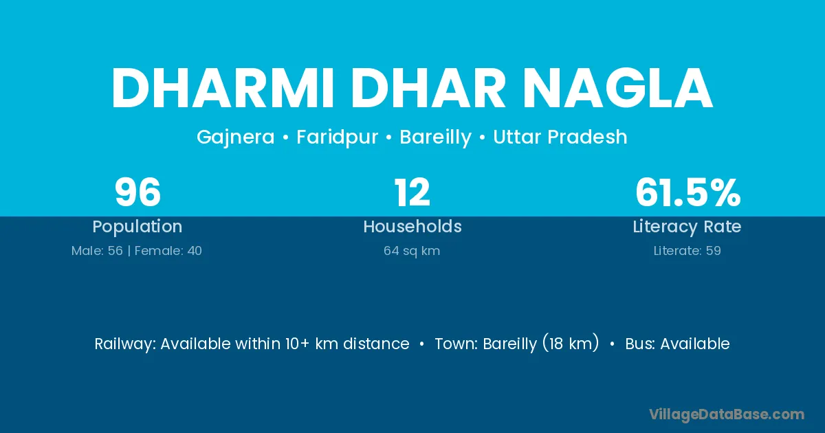 Bareilly (18 km) is the nearest town to Dharmi Dhar Nagla village for major economic activities and is located approximately 18 km away.