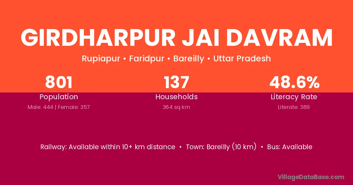 Bareilly (10 km) is the nearest town to Girdharpur Jai Davram village for major economic activities and is located approximately 10 km away.