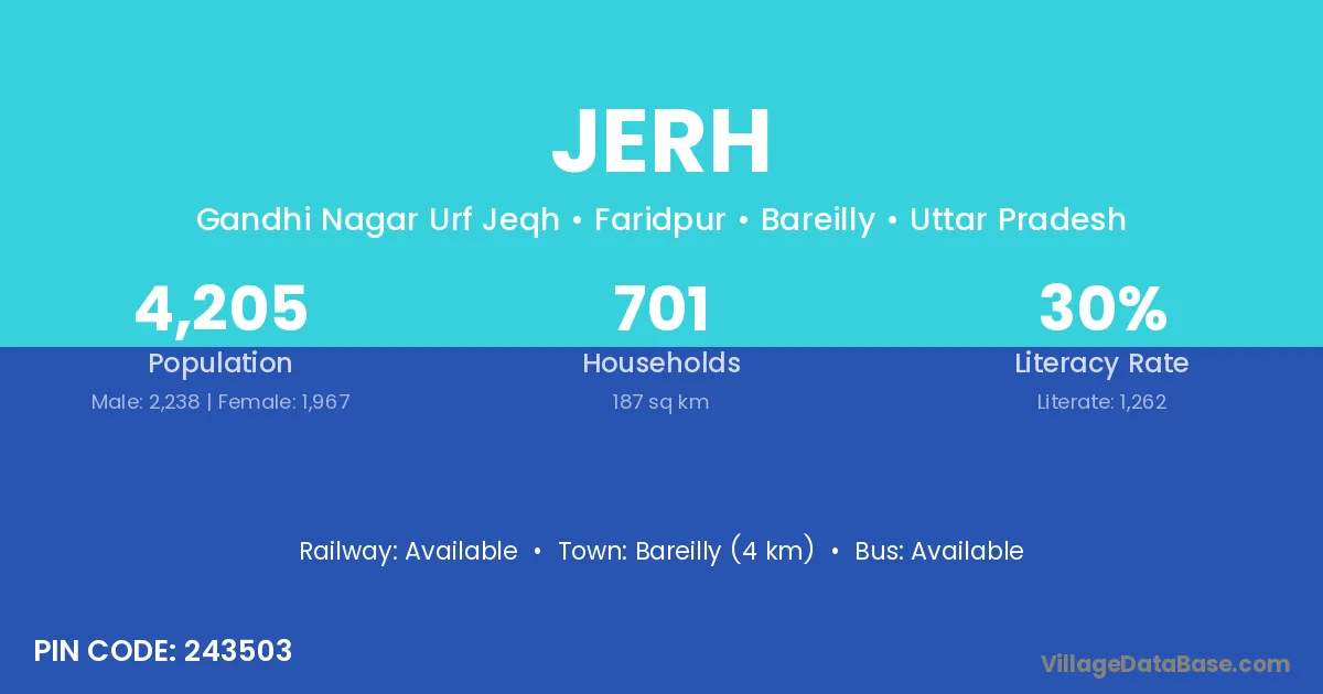 Bareilly (4 km) is the nearest town to Jerh village for major economic activities and is located approximately 4 km away.