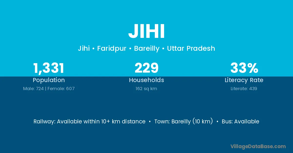 Bareilly (10 km) is the nearest town to Jihi village for major economic activities and is located approximately 10 km away.