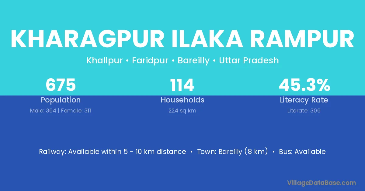 Bareilly (8 km) is the nearest town to Kharagpur Ilaka Rampur village for major economic activities and is located approximately 8 km away.