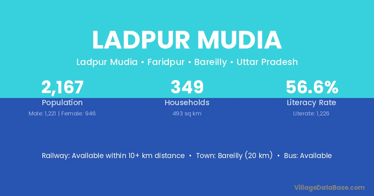 Bareilly (20 km) is the nearest town to Ladpur Mudia village for major economic activities and is located approximately 20 km away.