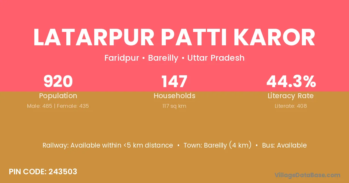 Bareilly (4 km) is the nearest town to Latarpur Patti Karor village for major economic activities and is located approximately 4 km away.