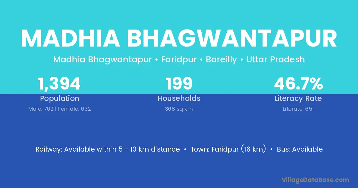 Faridpur (16 km) is the nearest town to Madhia Bhagwantapur village for major economic activities and is located approximately 16 km away.
