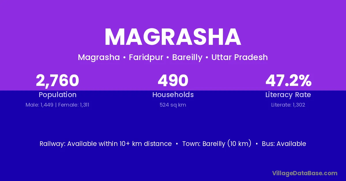 Bareilly (10 km) is the nearest town to Magrasha village for major economic activities and is located approximately 10 km away.