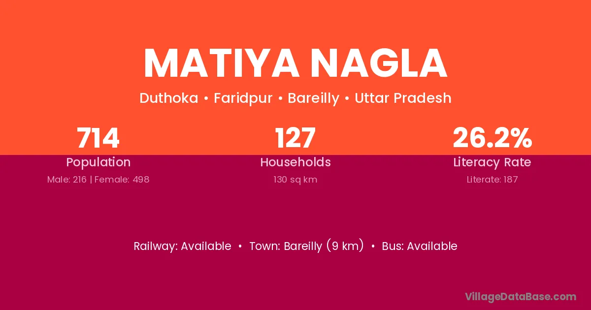 Matiya Nagla village has a total population of 714 people, of which 216 are males and 498 are females.