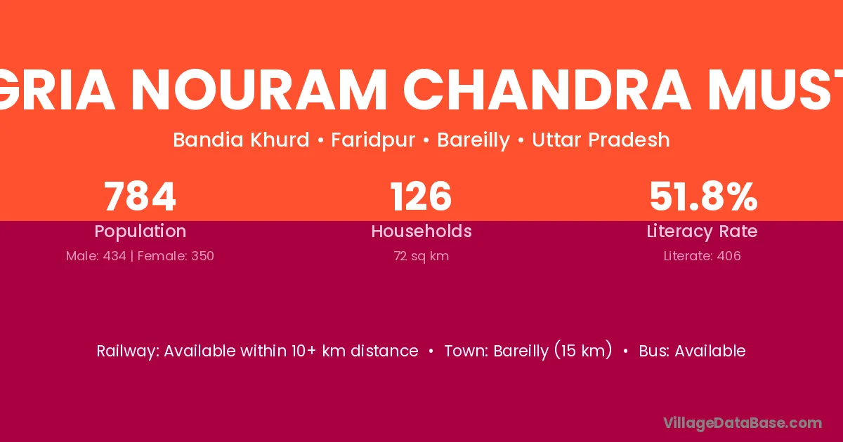 Bareilly (15 km) is the nearest town to Nagria Nouram Chandra Mustkil village for major economic activities and is located approximately 15 km away.