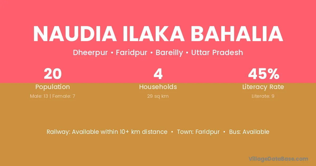 The literacy rate of Naudia Ilaka Bahalia village is 45.00%. Male literacy stands at 69.23% and female literacy at 0.00%.