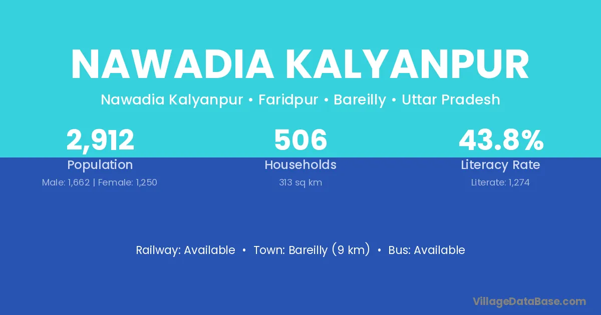 Bareilly (9 km) is the nearest town to Nawadia Kalyanpur village for major economic activities and is located approximately 9 km away.