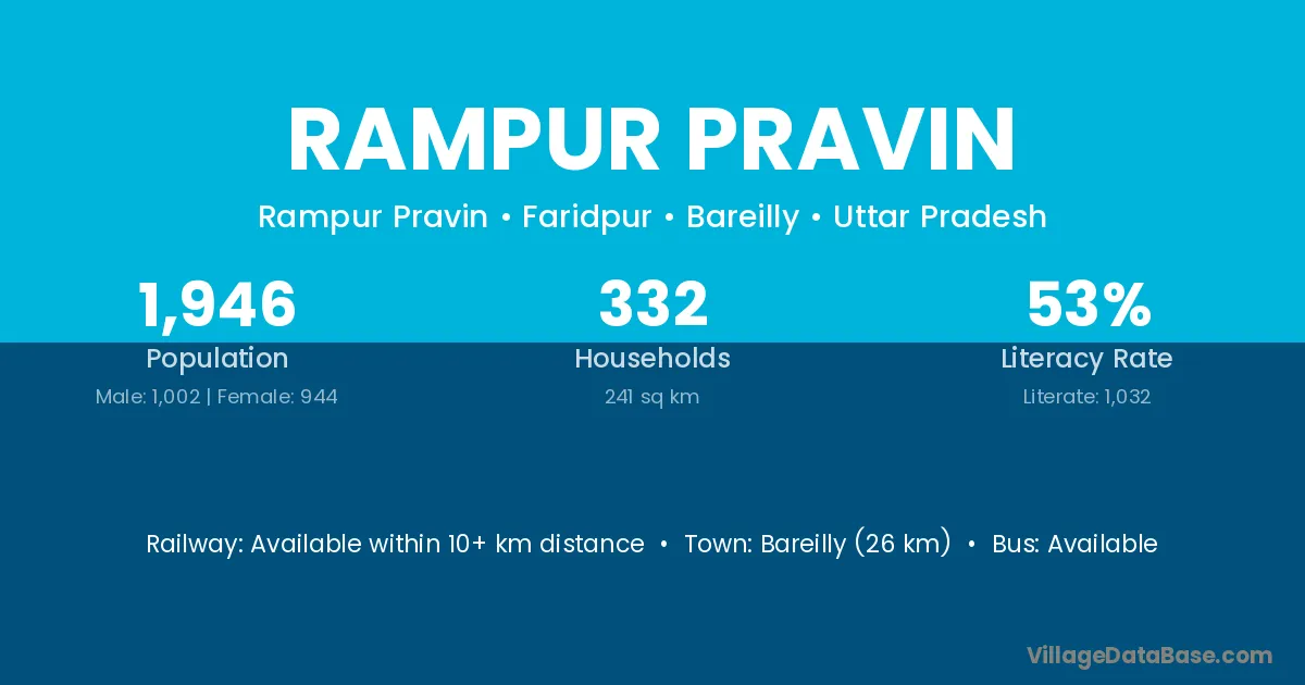Bareilly (26 km) is the nearest town to Rampur Pravin village for major economic activities and is located approximately 26 km away.