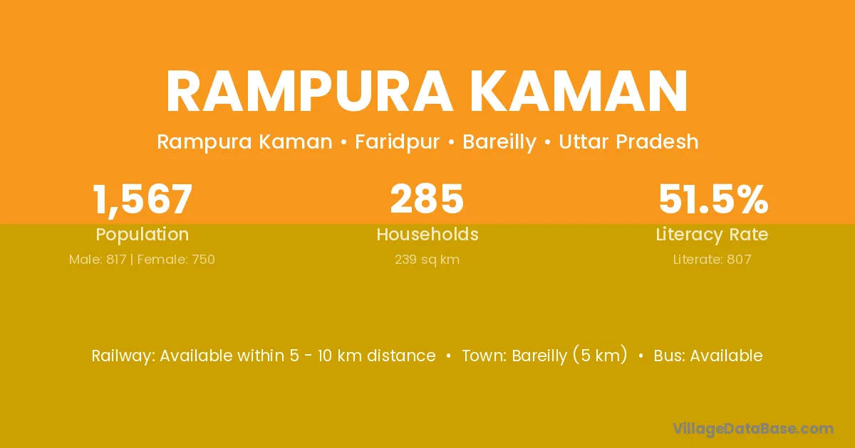 Bareilly (5 km) is the nearest town to Rampura Kaman village for major economic activities and is located approximately 5 km away.