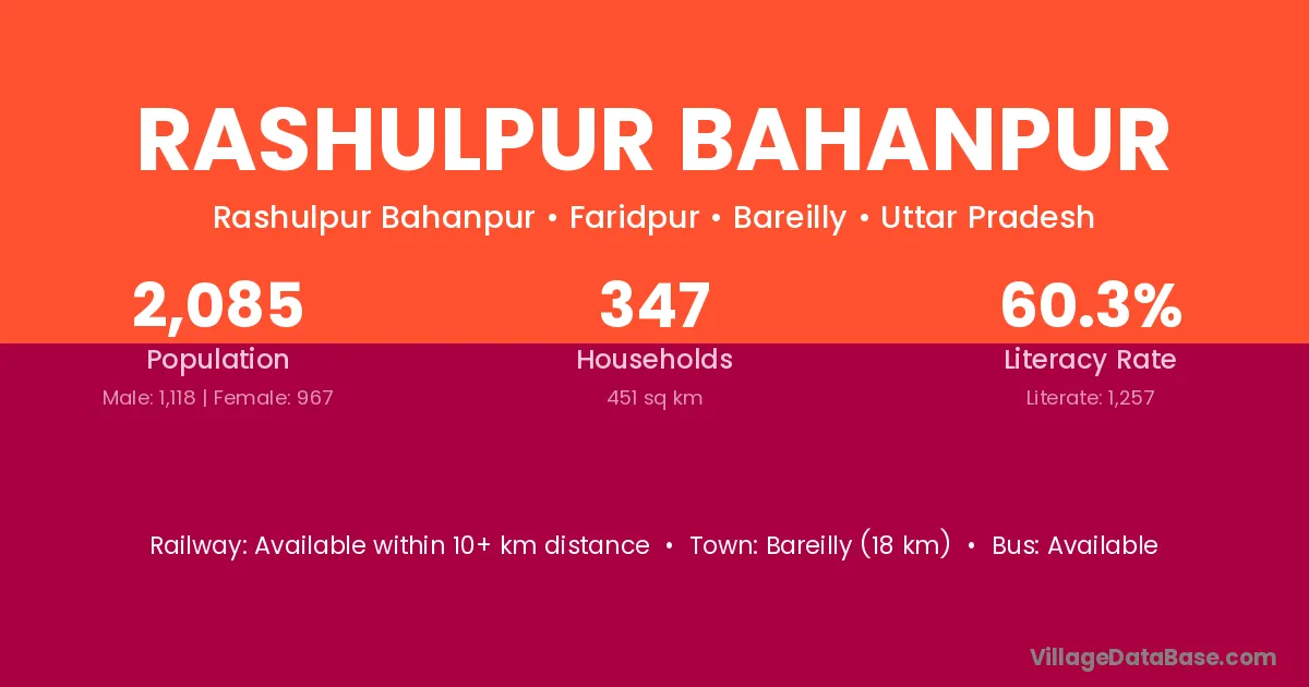 Bareilly (18 km) is the nearest town to Rashulpur Bahanpur village for major economic activities and is located approximately 18 km away.