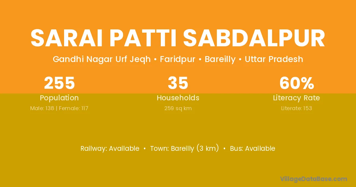 Bareilly (3 km) is the nearest town to Sarai Patti Sabdalpur village for major economic activities and is located approximately 3 km away.