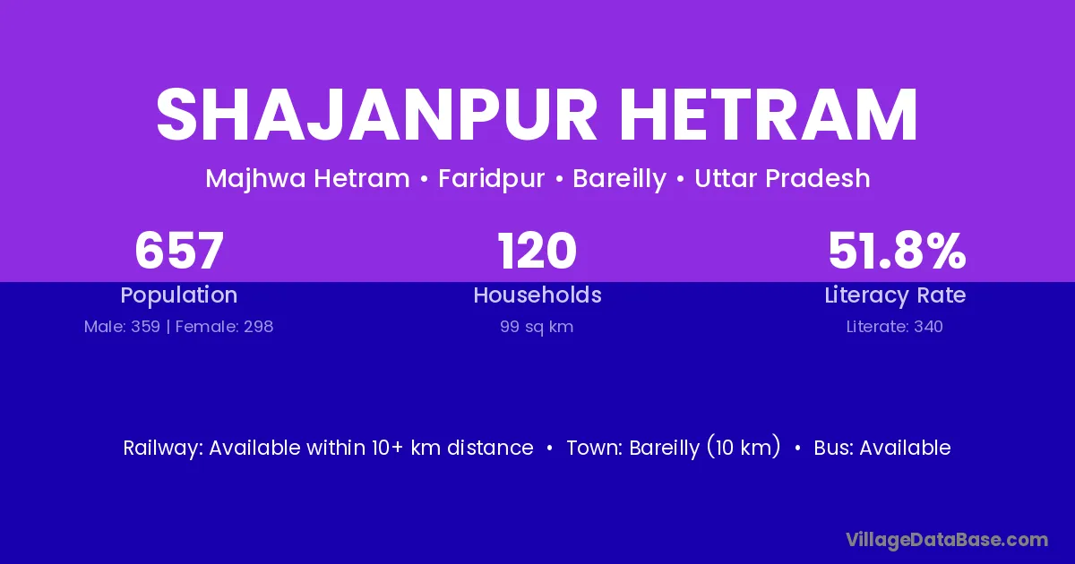 Bareilly (10 km) is the nearest town to Shajanpur Hetram village for major economic activities and is located approximately 10 km away.