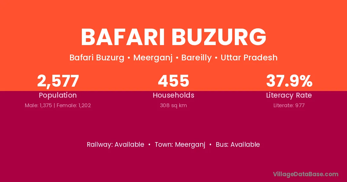 Meerganj is the nearest town to Bafari Buzurg village for major economic activities