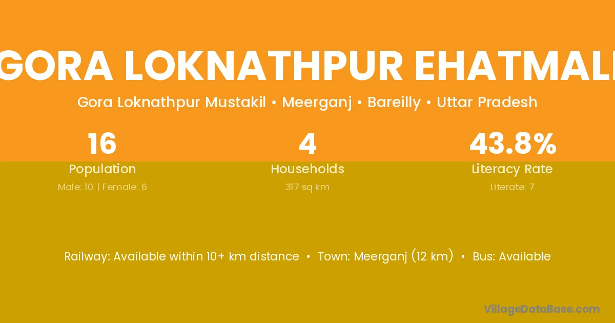 Meerganj (12 km) is the nearest town to Gora Loknathpur Ehatmali village for major economic activities and is located approximately 12 km away.