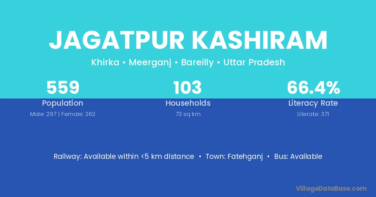 Jagatpur Kashiram village has a total population of 559 people, of which 297 are males and 262 are females.