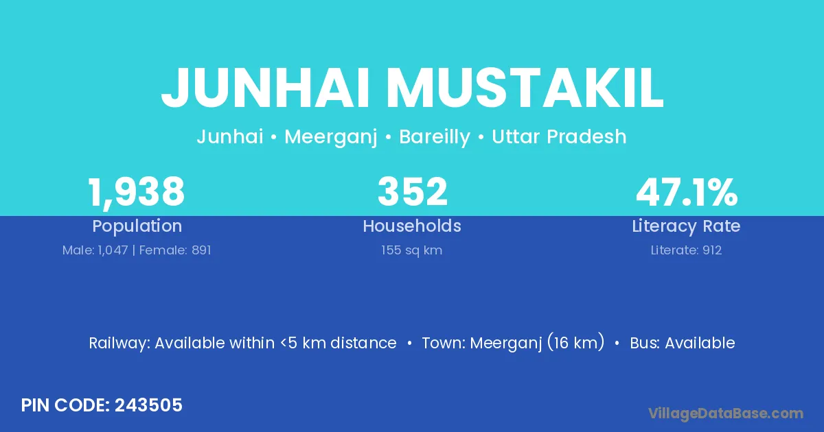 Meerganj (16 km) is the nearest town to Junhai Mustakil village for major economic activities and is located approximately 16 km away.