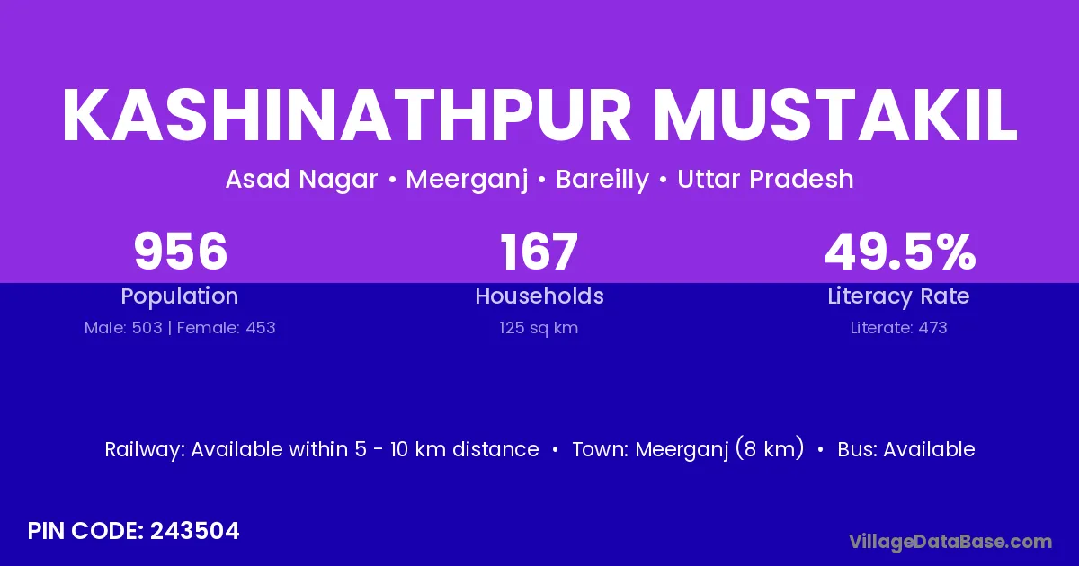 Meerganj (8 km) is the nearest town to Kashinathpur Mustakil village for major economic activities and is located approximately 8 km away.