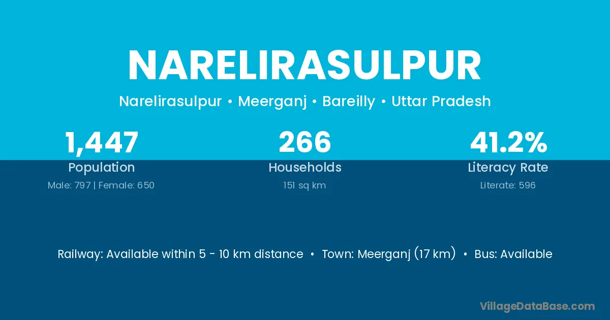 Meerganj (17 km) is the nearest town to Narelirasulpur village for major economic activities and is located approximately 17 km away.