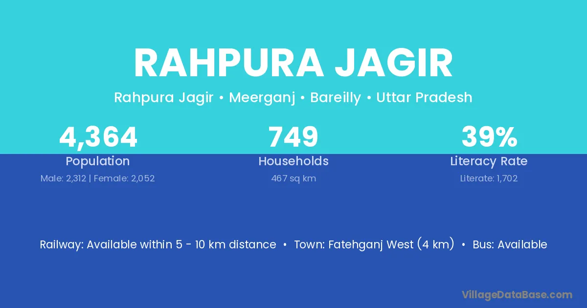 Fatehganj West (4 km) is the nearest town to Rahpura Jagir village for major economic activities and is located approximately 4 km away.