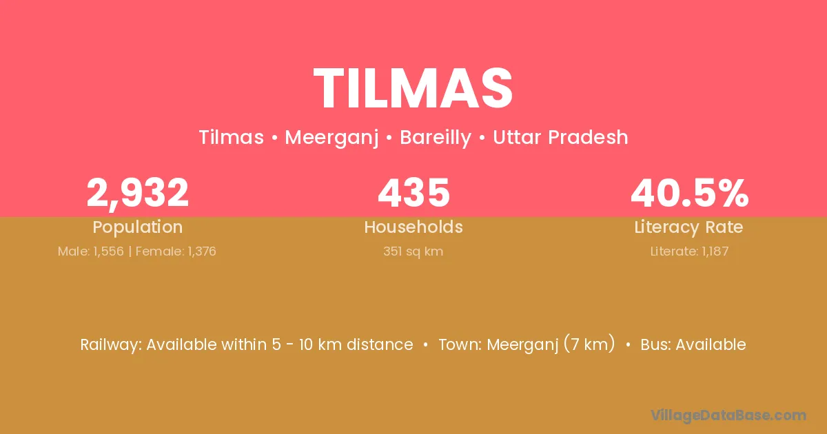 Meerganj (7 km) is the nearest town to Tilmas village for major economic activities and is located approximately 7 km away.