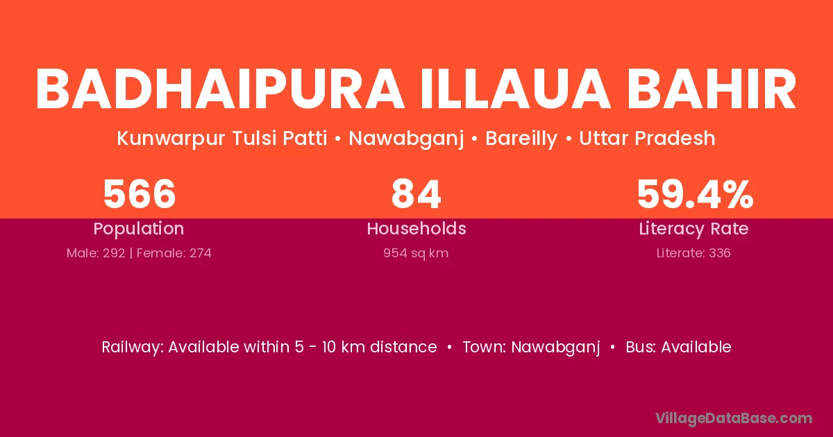 Badhaipura Illaua Bahir village has a total population of 566 people, of which 292 are males and 274 are females.