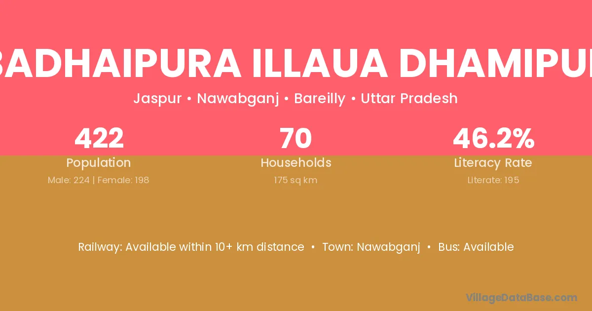 Badhaipura Illaua Dhamipur village has a total population of 422 people, of which 224 are males and 198 are females.