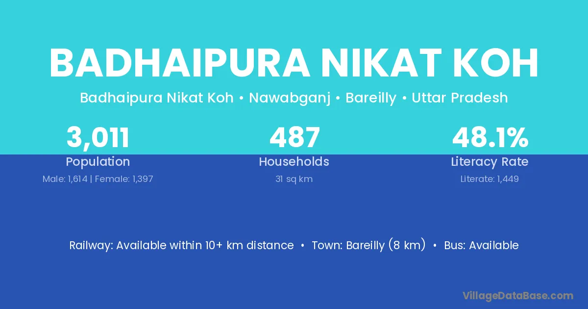 Bareilly (8 km) is the nearest town to Badhaipura Nikat Koh village for major economic activities and is located approximately 8 km away.