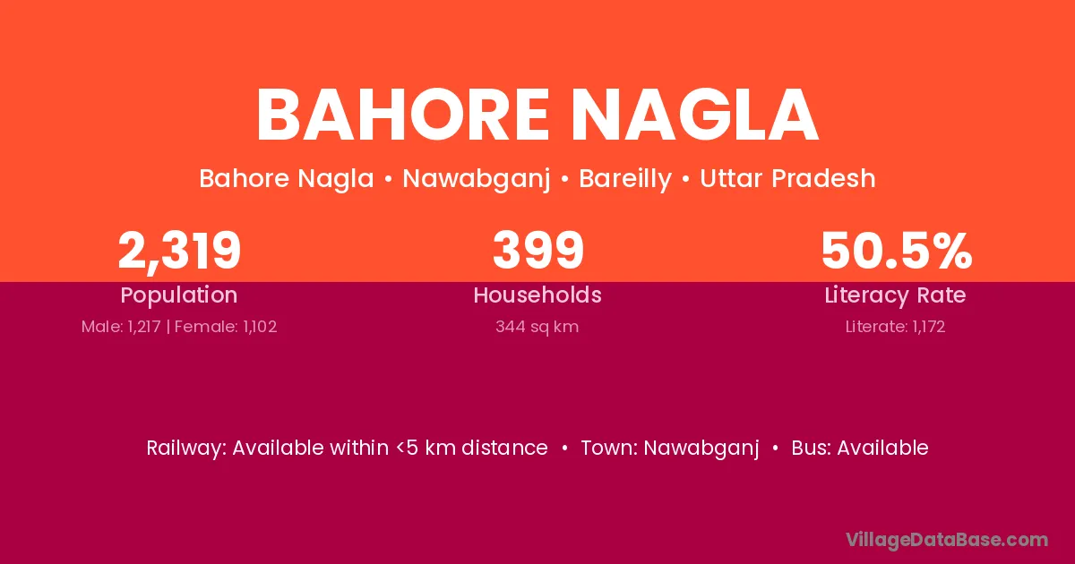 Bahore Nagla village has a total population of 2,319 people, of which 1,217 are males and 1,102 are females.