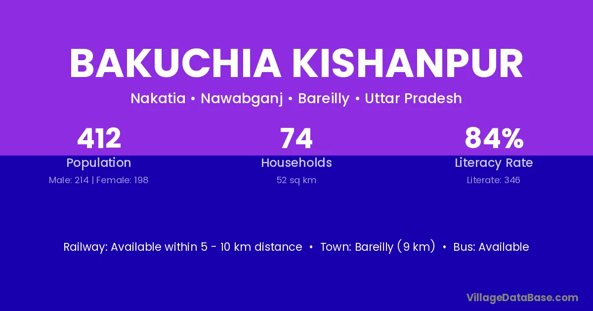 Bakuchia Kishanpur village has a total population of 412 people, of which 214 are males and 198 are females.