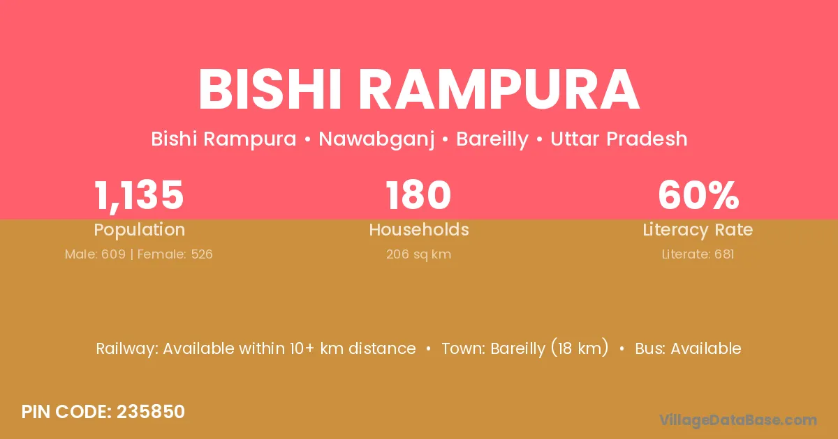 Bareilly (18 km) is the nearest town to Bishi Rampura village for major economic activities and is located approximately 18 km away.