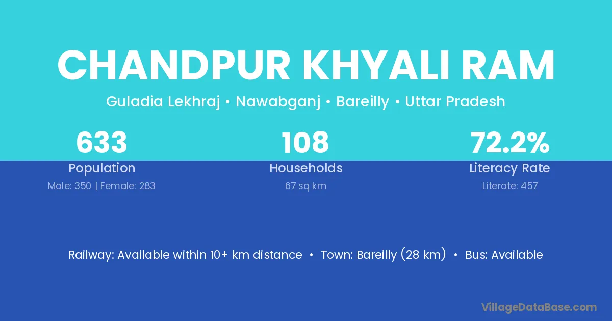 Bareilly (28 km) is the nearest town to Chandpur Khyali Ram village for major economic activities and is located approximately 28 km away.