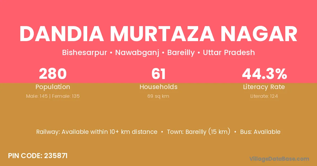 Bareilly (15 km) is the nearest town to Dandia Murtaza Nagar village for major economic activities and is located approximately 15 km away.