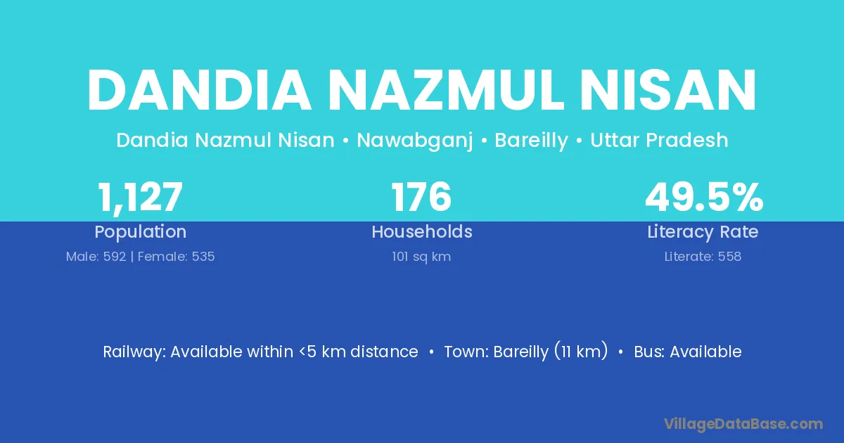 Bareilly (11 km) is the nearest town to Dandia Nazmul Nisan village for major economic activities and is located approximately 11 km away.