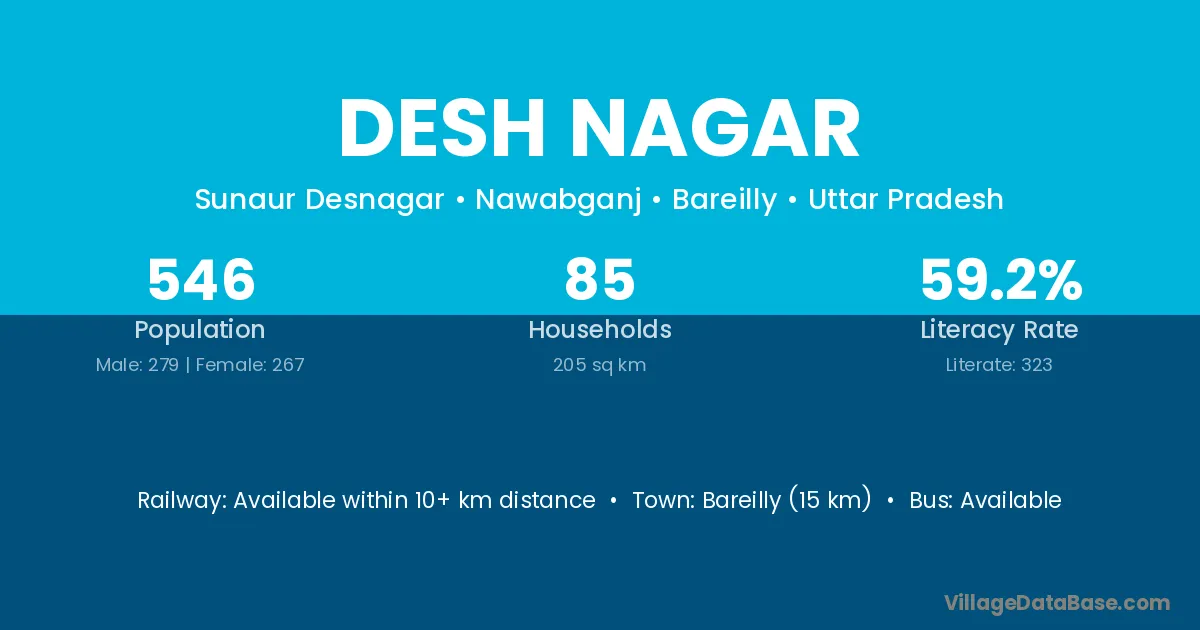 Bareilly (15 km) is the nearest town to Desh Nagar village for major economic activities and is located approximately 15 km away.