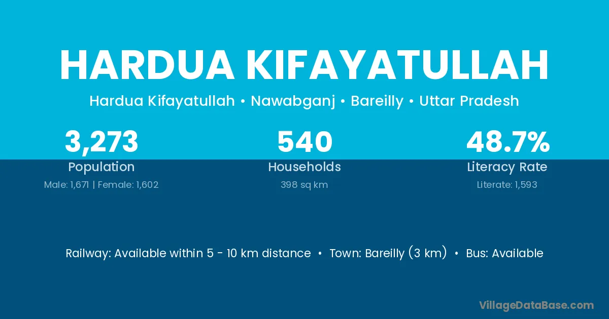 Bareilly (3 km) is the nearest town to Hardua Kifayatullah village for major economic activities and is located approximately 3 km away.