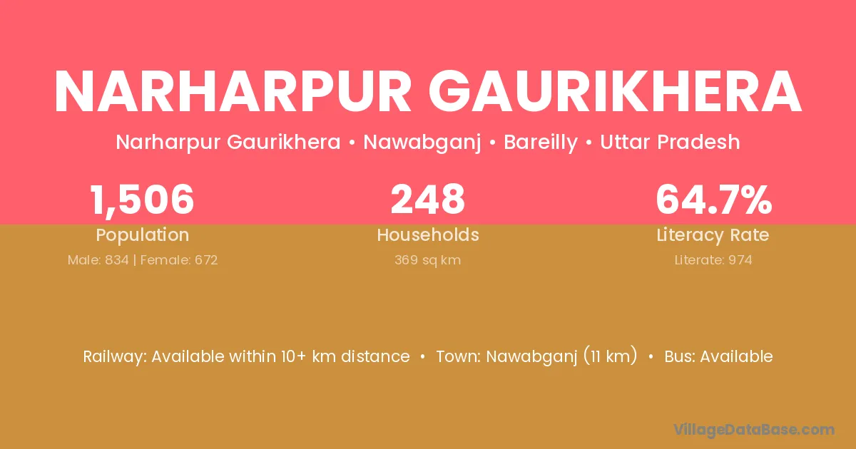 Nawabganj (11 km) is the nearest town to Narharpur Gaurikhera village for major economic activities and is located approximately 11 km away.