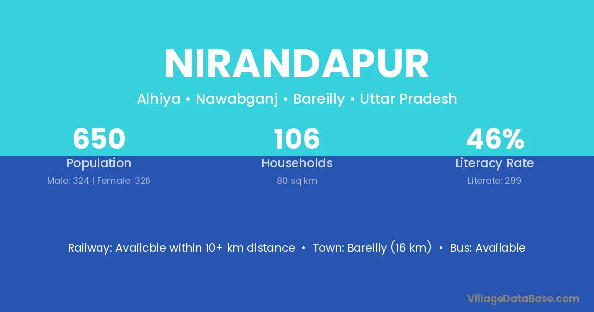 Bareilly (16 km) is the nearest town to Nirandapur village for major economic activities and is located approximately 16 km away.
