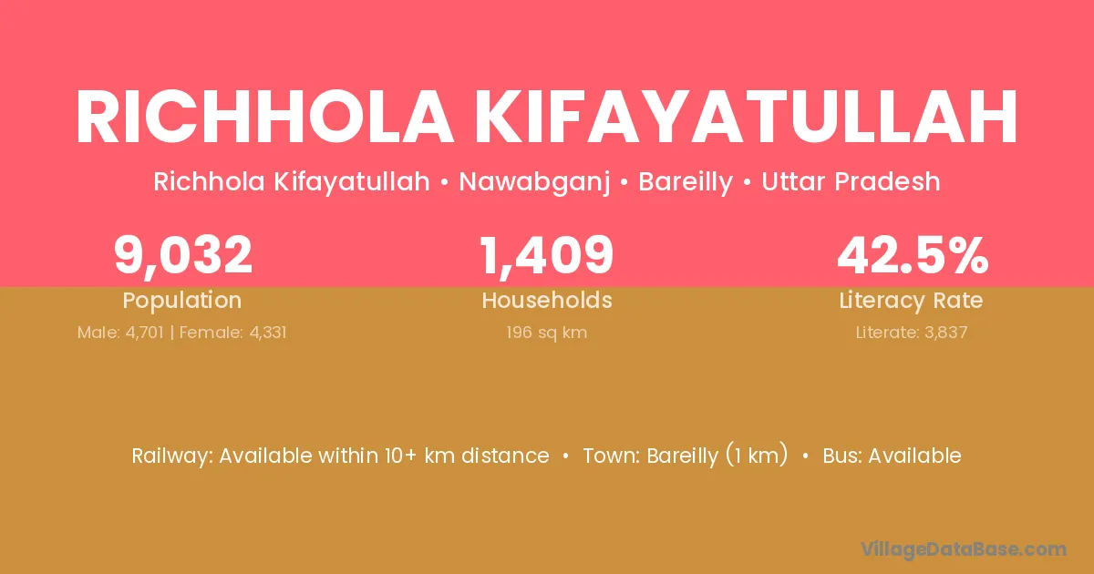 Richhola Kifayatullah village has a total population of 9,032 people, of which 4,701 are males and 4,331 are females.