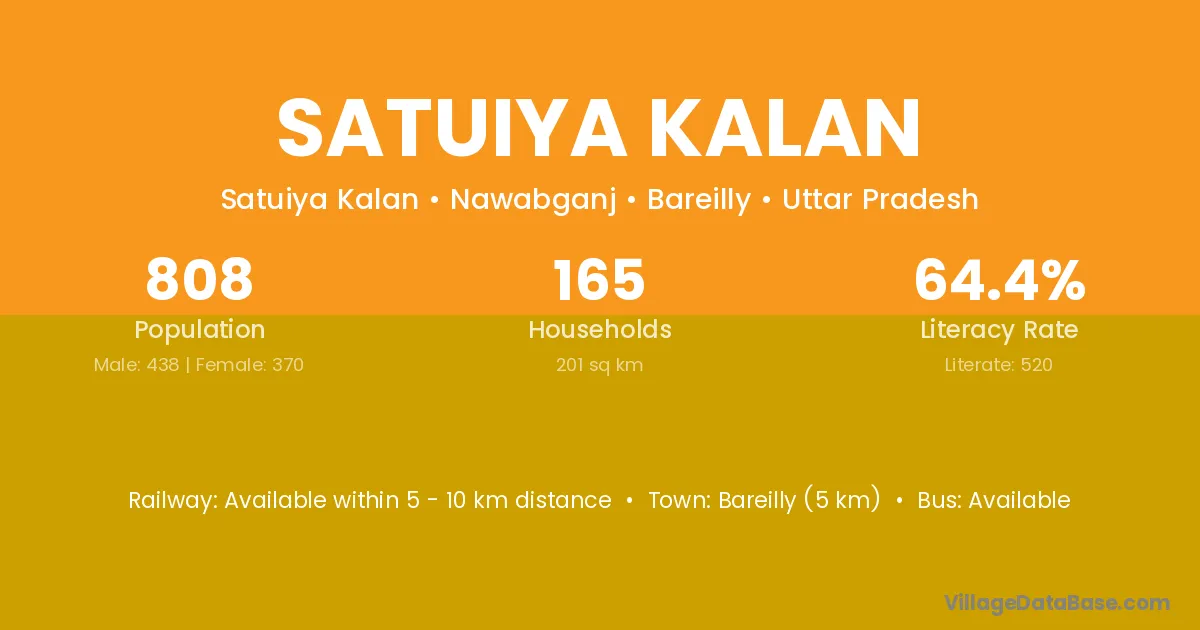 Bareilly (5 km) is the nearest town to Satuiya Kalan village for major economic activities and is located approximately 5 km away.