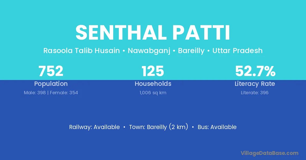 Bareilly (2 km) is the nearest town to Senthal Patti village for major economic activities and is located approximately 2 km away.