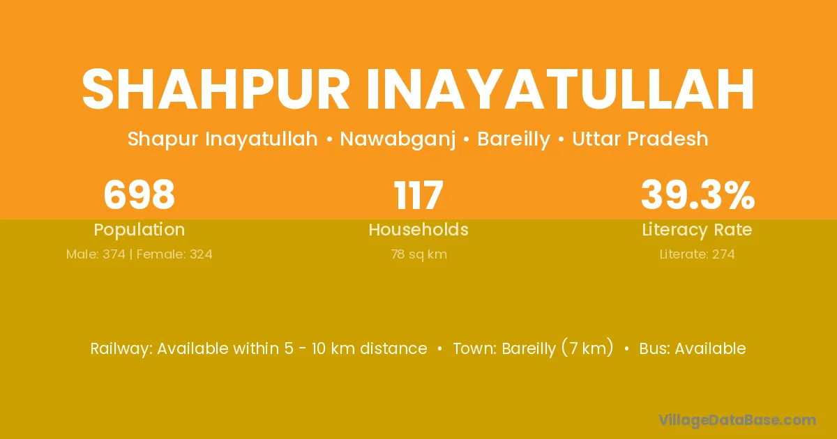 Bareilly (7 km) is the nearest town to Shahpur Inayatullah village for major economic activities and is located approximately 7 km away.