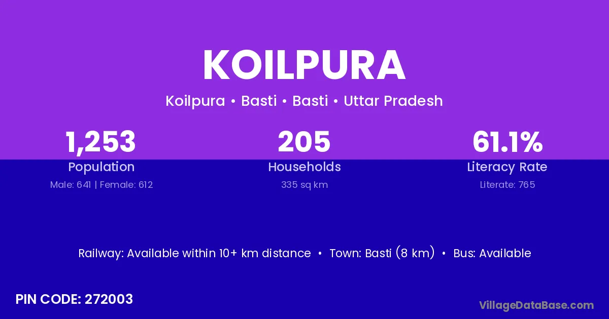 Basti (8 km) is the nearest town to Koilpura village for major economic activities and is located approximately 8 km away.